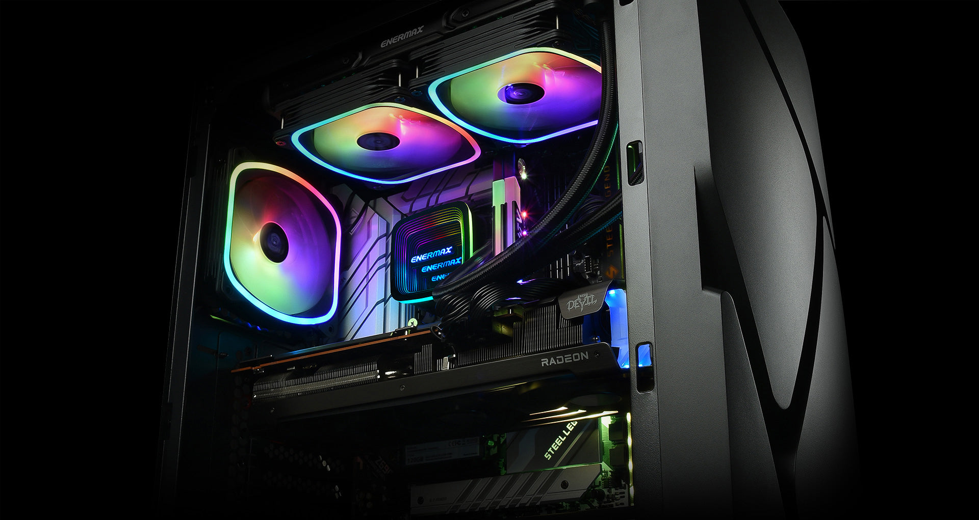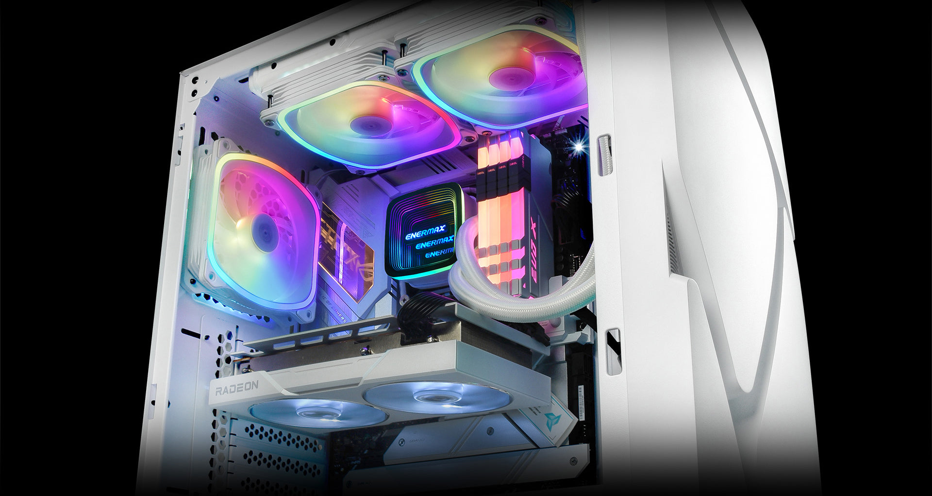 Preset 10 lighting effects; use the attached ENERMAX RGB control box to select your preferred lighting mode, brightness and speed. (Included with 360mm model only)
