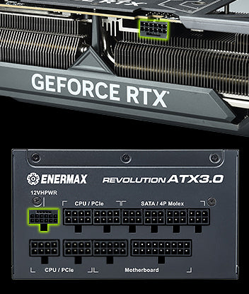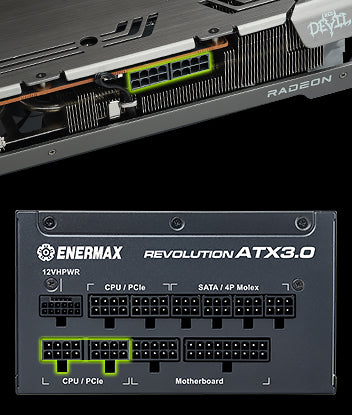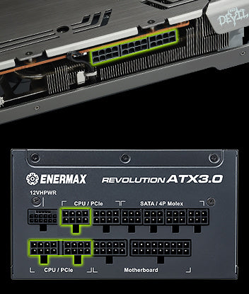 Revolution ATX3.0 series is ENERMAX’s first power supply that is fully compatible with Intel ATX 3.0 specification. To prepare for the next-gen graphics cards, the series is designed with one native PCIe Gen 5 12+4 pin 12VHPWR connector with power output up to 600W, an extra one dual 8 pin to 12+4 pin (12VHPWER) cable will also be included for gamers and creators to install up to 2 of the latest NVIDIA graphics cards.